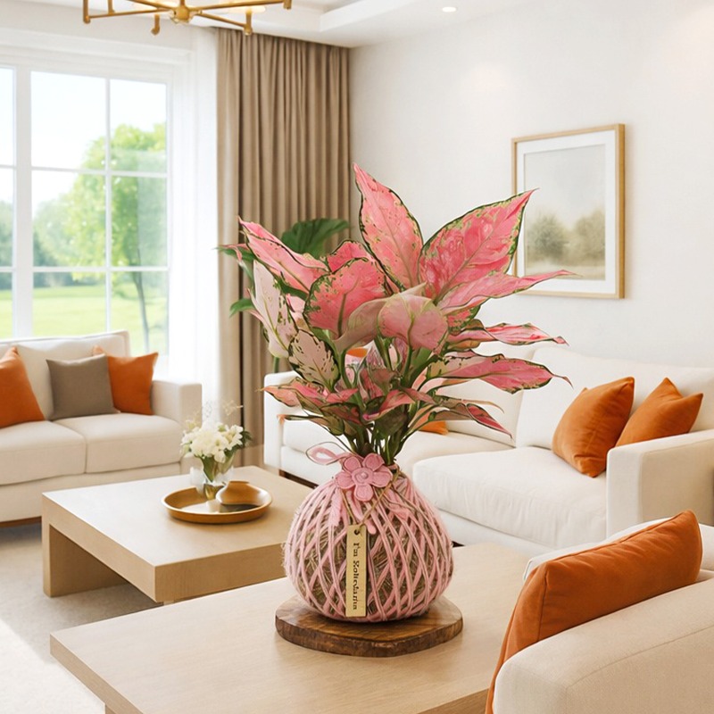Vibrant pink leaves paired with soft green tones make this aglaonema kokedama a cheerful décor accent. Wrapped in moss, it’s perfect for adding colour and freshness to desks or side tables.